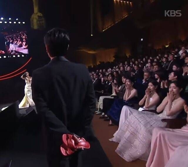 Hwasa, who prepared a celebratory stage for the Blue Dragon Film Awards with “Good Goodbye,” released on the 15th of last month, appeared barefoot. While singing, she walked down the aisle toward the audience, and scenes from the music video played on a large screen. The music video starred Park Jung-min and Hwasa as the main characters.Park Jung-min, who had been sitting in the audience, suddenly appeared in front of Hwa-sa holding a pair of red high heels and reenacted the music video. Park Jung-min handed her the shoes, and Hwa-sa smiled and threw them away, matching the confident theme of the song, which is about a breakup. Many actresses sitting in the front row were so moved by the sight of Park Jung-min and Hwa-sa that they put their hands to their lips in amazement.