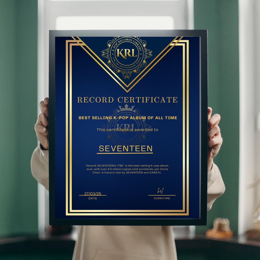 This triumph surpassed the previous record held by BTS’s “Map of the Soul: 7,” which sold 5.03 million copies. The K-Pop Records Library proudly issued SEVENTEEN a certificate for this feat, cementing “FML” as a landmark in K-pop history.