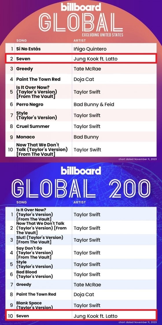 Jungkook’s solo single “Seven,” released on July 14, 2023, ranked 2nd on Billboard’s “Global (Excl. US)” chart for the week of November 11, 2023. “Seven” also ranked 10th on Billboard’s “Global 200” chart.