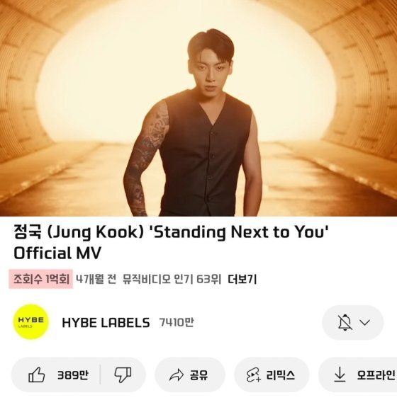 The music video for Jungkook’s solo song ‘Standing Next to You’, released on November 3 (Korean time), reached 100 million views on YouTube on March 8.