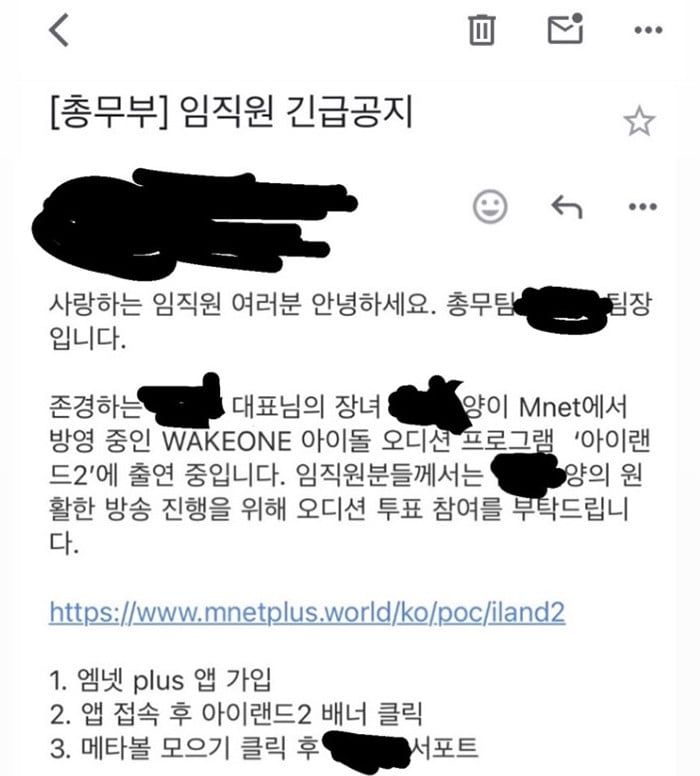 The Mnet and WAKEONE idol audition program ‘I-Land 2’ features our renowned President ***’s oldest daughter, Ms. ***. Please vote for Ms. *** for her continuing program participation, workers.”