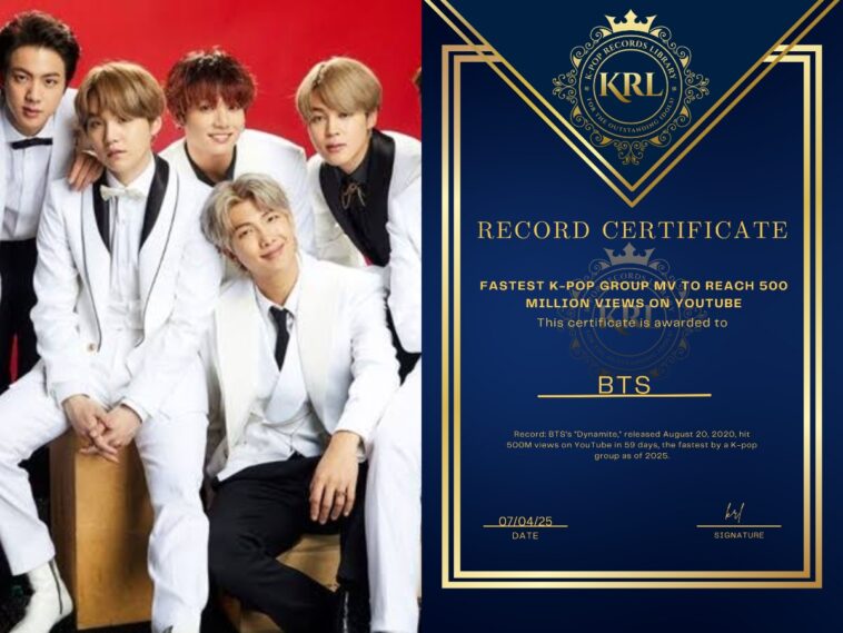 The K-Pop Records Library awarded BTS a certificate, honoring “Dynamite”’s 59-day sprint as a testament to their global reign and ARMY’s dedication, setting a new benchmark for K-pop group MVs in 2020.