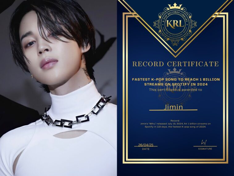The K-Pop Records Library awarded Jimin a certificate, celebrating “Who”’s 118-day sprint to 1 billion streams as a dazzling showcase of K-pop’s streaming dominance in 2024.