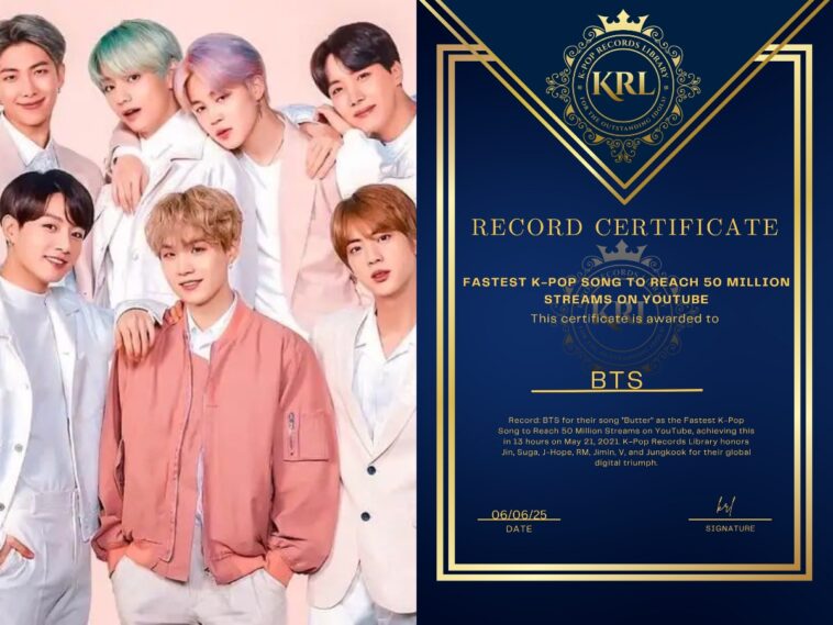K-Pop Records Library is buzzing with excitement to celebrate a digital milestone that redefined K-Pop’s global reach: BTS’s “Butter” holds the record as the Fastest K-Pop Song to Reach 50 Million Streams on YouTube, achieving this in a staggering 13 hours on May 21, 2021. K-Pop Records Library proudly honors this achievement, showcasing BTS’s unmatched influence and the unstoppable force of their fandom, ARMY.