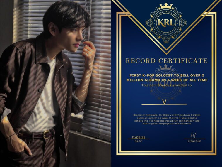On September 13, 2023, the Kpop Records Library certified V of BTS as the first K-pop soloist to sell over 2 million albums in a week with his debut solo album Layover, achieving 2,101,974 units on the Hanteo Chart.