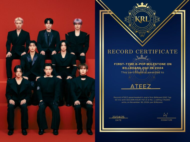 The K-Pop Records Library awarded ATEEZ a certificate, honoring their No. 1 peak with GOLDEN HOUR: Part.2 as the cornerstone of K-pop’s first Billboard 200 Top 10 trio, a dazzling leap for the genre’s US chart dominance in 2024.