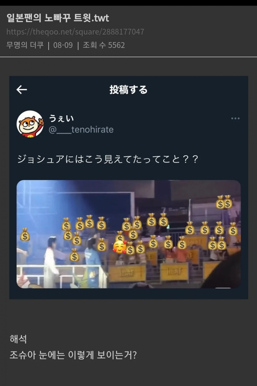 A Japanese Twitter user asked, “Is this what Joshua saw?” he included a photograph with money bags over his admirers.