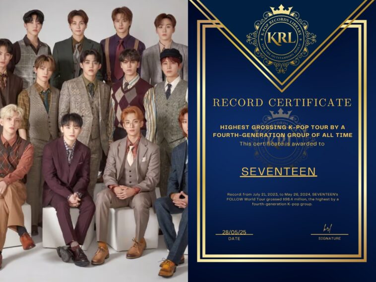 From July 21, 2023, to May 26, 2024, the Kpop Records Library certified SEVENTEEN’s FOLLOW World Tour as the highest-grossing K-pop tour by a fourth-generation group, earning $98.4 million from 865,000 tickets sold across 24 shows reported to Billboard.