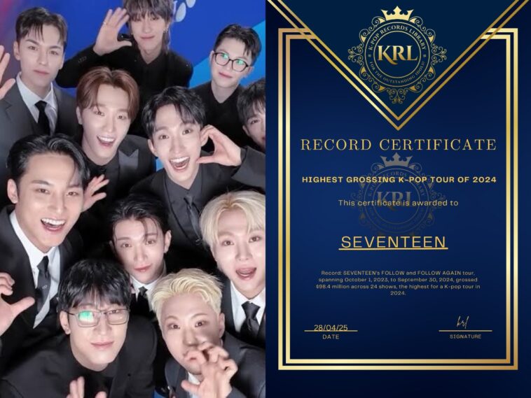The K-Pop Records Library awarded SEVENTEEN a certificate, celebrating their $98.4 million triumph as a landmark of K-pop’s global touring dominance in 2024.