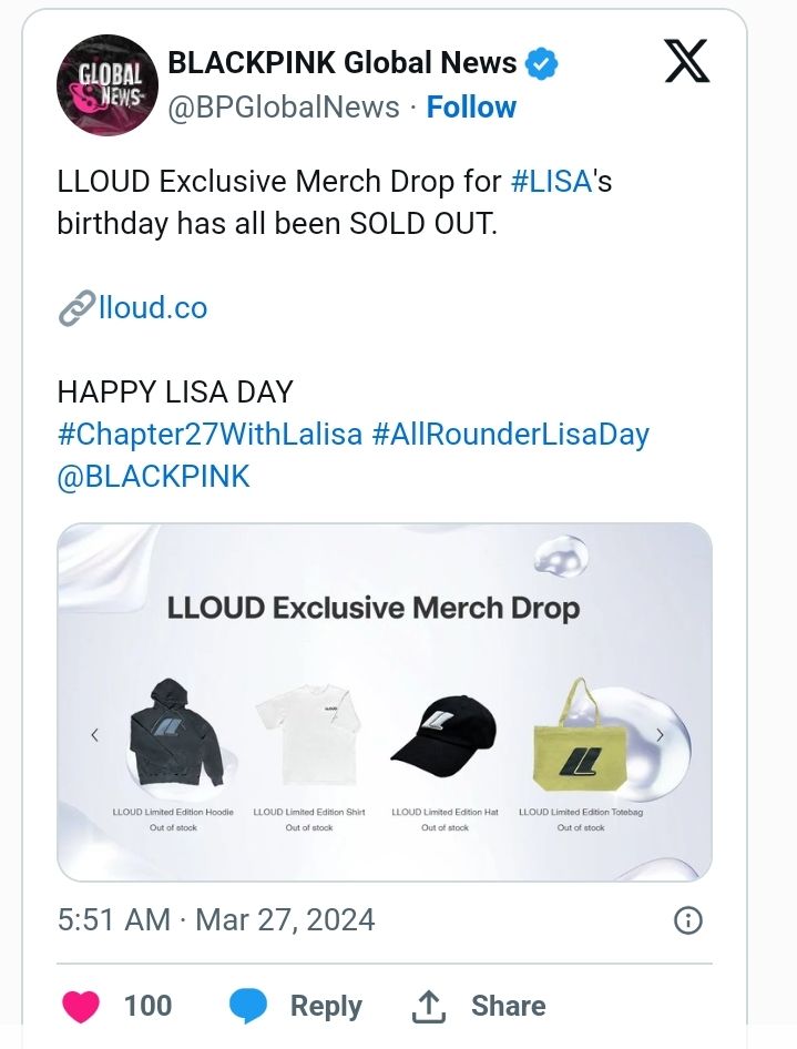On March 27, BLACKPINK’s LISA unveiled LLOUD-branded goods for her 27th birthday. A limited edition of 327 black hoodies, white short-sleeved T-shirts, black caps, and yellow-green tote bags were available online. MD prices were $65, $35, $30, and $30.