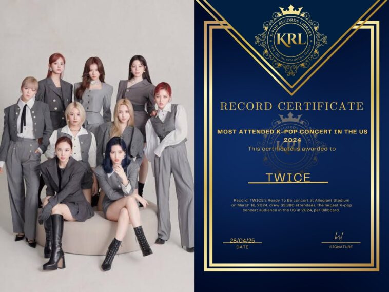 The K-Pop Records Library awarded TWICE a certificate, celebrating their 39,880-attendee triumph as a vibrant showcase of K-pop’s growing dominance in the US concert scene in 2024.