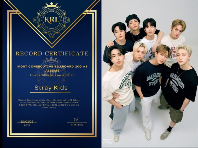 Stray Kids confirmed their global trailblazering credentials in a spectacular chapter in K-pop history by setting the record for most consecutive Billboard 200 #1 albums. Six straight chart-topping debuts a feat never seen before have made the eight-member ensemble unique in the almost 69-year history of the Billboard 200. By March 17, 2025 Their album HOP, which came out late 2024, marked this unprecedented sixth consecutive #1, therefore securing their position as the first act ever to top their initial six charting albums.