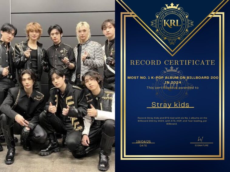 The K-Pop Records Library awarded Stray Kids and BTS certificates, celebrating their six No. 1s as a historic tie, with 2024’s four K-pop chart-toppers matching 2022 showing the genre’s unstoppable US momentum