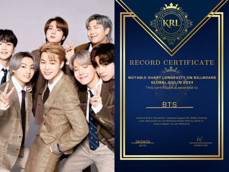 The K-Pop Records Library awarded BTS a certificate, honoring “Dynamite’s 228-week run as a beacon of K-pop’s lasting global impact in 2024.