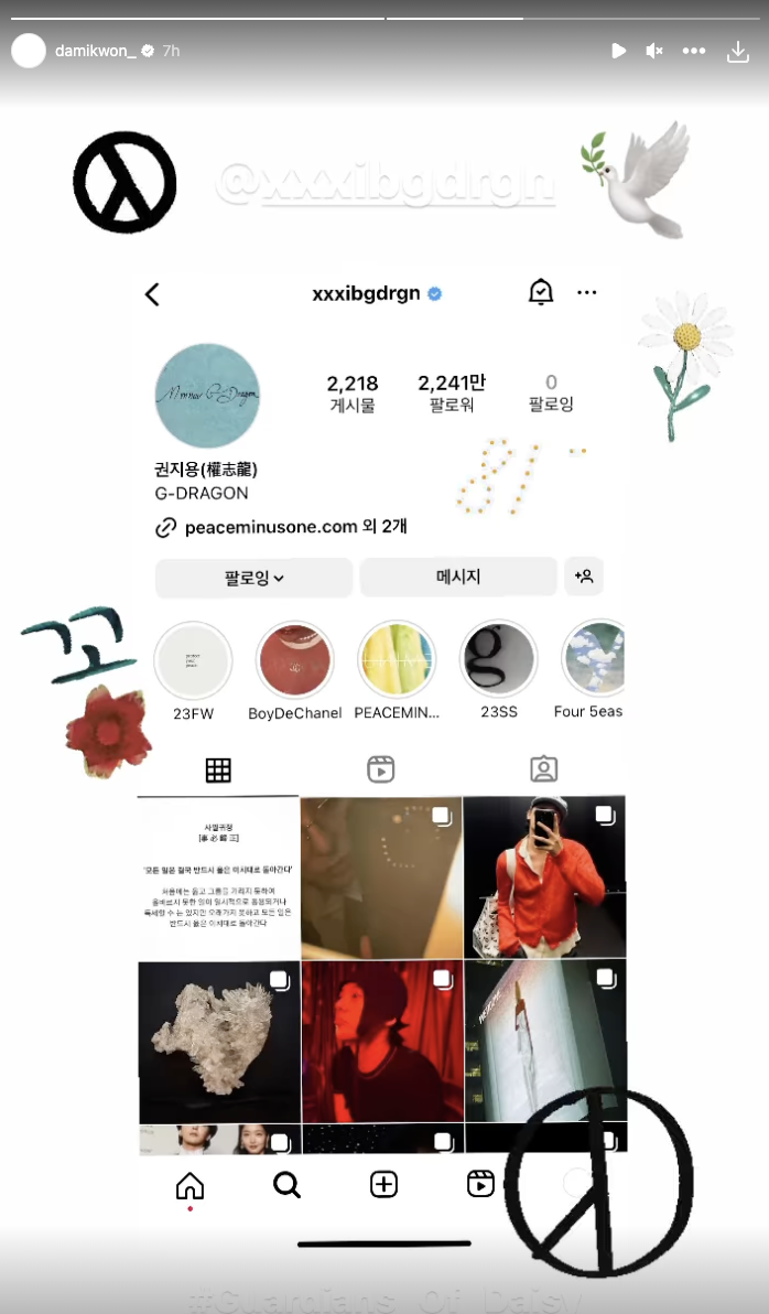Kwon Dami took part in a campaign run by G-Dragon’s Instagram followers on November 14. She utilized the “Daisy” filter, which incorporates the firm’s emblem and insignia, along with the hashtags “Guardians of Daisy” and “We stand with GD” for her fashion brand.