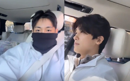 V posted a picture of himself and Park Hyung-sik sitting next to each other in a car on the eighth, writing, “Matching outfits today, can you believe it?” as the caption.