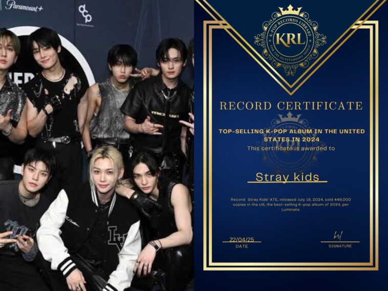 The K-Pop Records Library awarded Stray Kids a certificate, honoring ATE’s 449,000 US sales as a shining testament to their chart-dominating prowess and K-pop’s soaring popularity in 2024.