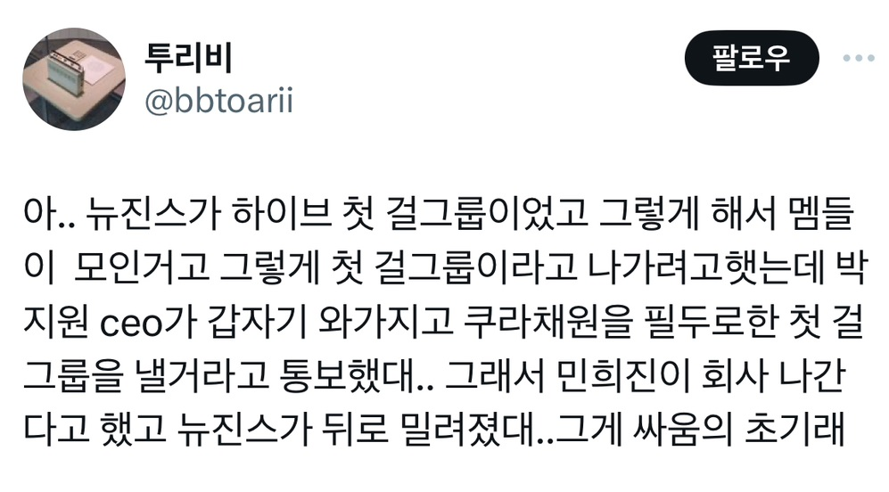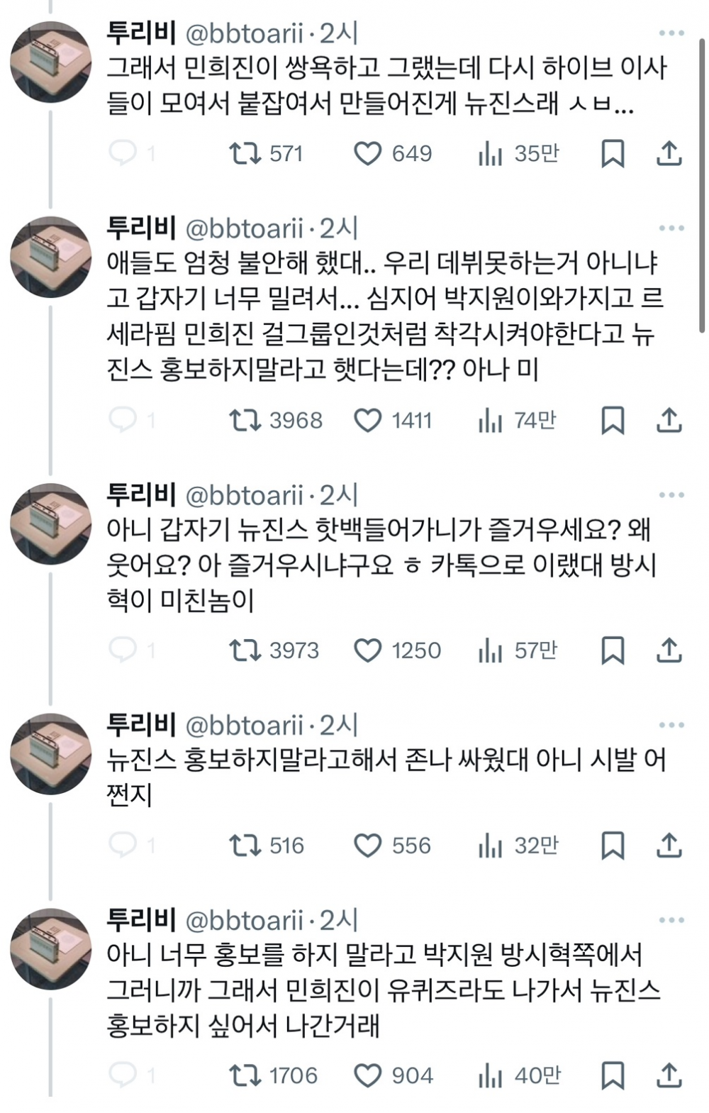 The user wrote, “HYBE’s first girl group was scheduled to be NewJeans, so the members were collected, but CEO Park Ji Won informed them that Sakura and Chae Won would debut first. Min Hee Jin announced her departure from the company, pushing back NewJeans. The feud begins then.”